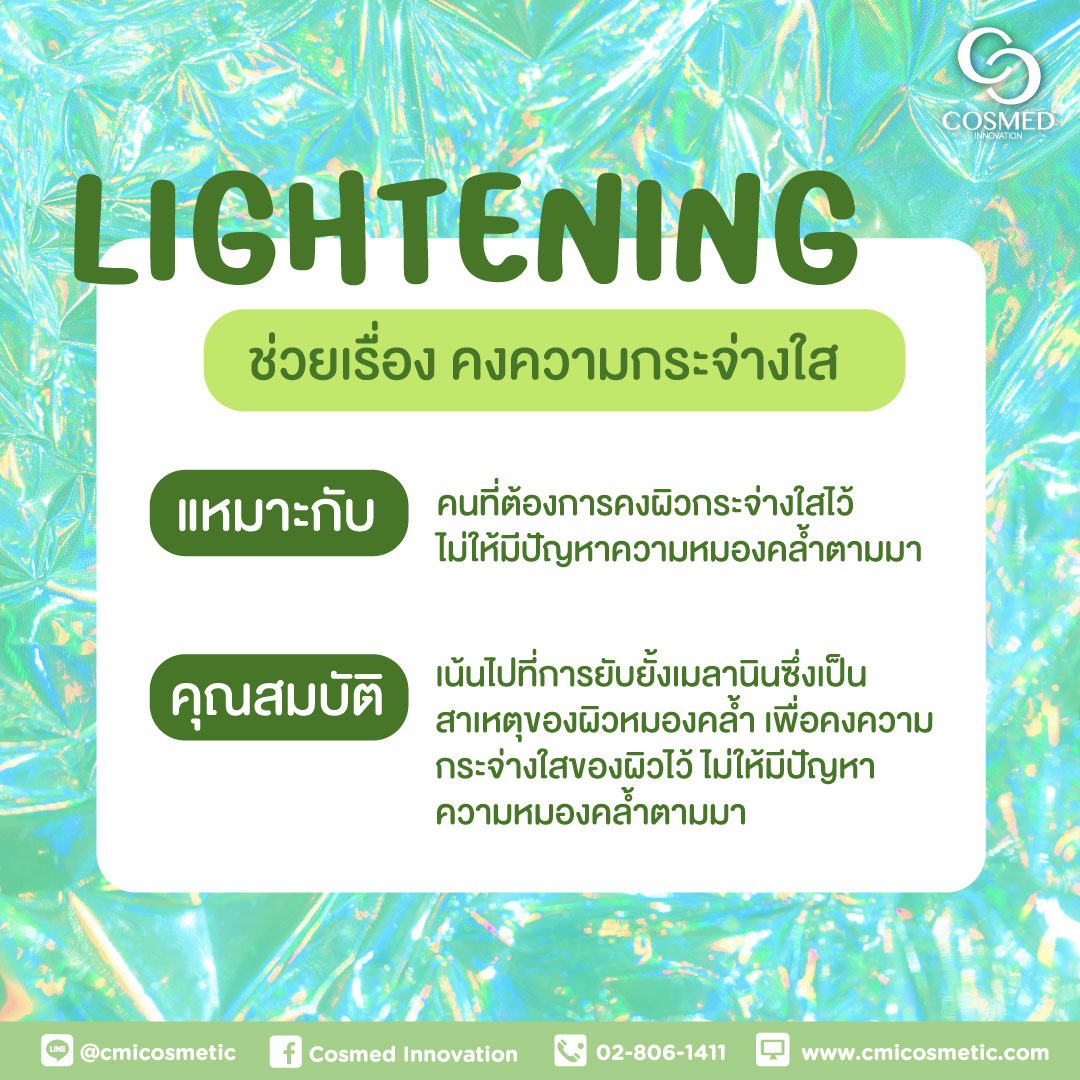 ช่วยเรื่องคงความกระจ่างใส เหมาะกับคนที่ต้องการคงผิวกระจ่างใสไว้ ไม่ให้มีปัญหาความหมองคล้ำตามมา คุณสมบัติเน้นไปที่การยับยั้งเมลานิน ซึ่งเป็นสาเหตุของผิวหมองคล้ำ เพื่อคงความกระจ่างใสของผิวไว้ไม่ให้มีปัญหาความหมองคล้ำตามมา